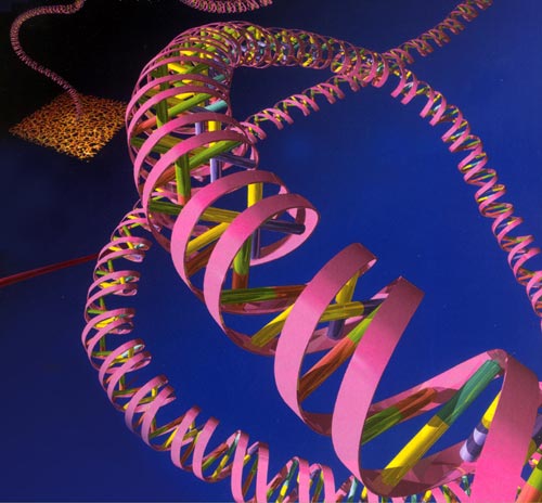 1953年4月25日,世界權(quán)威雜志《自然》雜志發(fā)表了沃森、克里克的一篇900多字優(yōu)美精煉的短文,宣告了DNA分子雙螺旋結(jié)構(gòu)模型的誕生。這個(gè)結(jié)構(gòu)模型的要義是:DNA是一個(gè)長長的雙鏈分子,由兩條同軸反向相互纏繞的多核苷酸鏈組成,外側(cè)是由脫氧核糖和磷酸根組成的分子骨架,中間是由互補(bǔ)的堿基對(duì)組成的階梯,堿基配對(duì)方式是A配T,C配G;堿基對(duì)間距為0.34納米,每10個(gè)堿基對(duì)形成一個(gè)螺旋周期,螺旋直徑為1納米。這個(gè)模型既能從螺旋性、分子直徑、堿基對(duì)的幾何學(xué)尺度等方面闡明X射線衍射圖像,又能以堿基專一性互補(bǔ)配對(duì)來解釋查伽夫當(dāng)量定律。DNA雙螺旋結(jié)構(gòu)是一個(gè)極為成功、無懈可擊的DNA分子結(jié)構(gòu)模型,它由兩條右旋但反向的鏈在同一個(gè)軸上盤而成,像一個(gè)螺旋形的梯子,生命的遺傳密碼就列在梯子橫檔上。據(jù)科學(xué)家統(tǒng)計(jì),一個(gè)體細(xì)胞的全部DNA“螺旋樓梯”長約2米。若將一個(gè)人的全部DNA連接起來,可以在地球和太陽之間扯上80個(gè)來回。 DNA分子雙螺旋結(jié)構(gòu)模型的發(fā)現(xiàn),是生物學(xué)史上的一座里程碑; 1962年,沃森、克里克因發(fā)現(xiàn)DNA分子結(jié)構(gòu),與改進(jìn)了X射線衍射技術(shù)的威爾金斯一起獲得了諾貝爾醫(yī)學(xué)或生理學(xué)獎(jiǎng)。