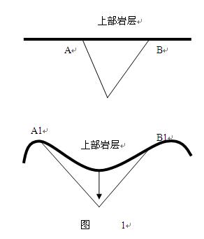 冰輒理論認為:地殼運動與巖漿無關(guān),它是地殼自身結(jié)構(gòu)關(guān)系的進一步調(diào)整,是地殼自身重力作用的結(jié)果。至于山脈的形成,我認為同樣與地下斷裂密切相關(guān),地下斷裂是地質(zhì)活動的結(jié)果,地下斷裂的的擴大與發(fā)展更是地質(zhì)活動的基本運動形式。隨著地下斷裂的擴大與發(fā)展,底層斷裂區(qū)域承壓能力逐漸降低,上部巖層也因地下斷裂的擴大,最終發(fā)生自身重力作用下的區(qū)域性沉降。如圖1所示AB、A1B1為斷裂上部的巖層,初始階段斷裂較小上部巖層AB無彎曲,隨著時間的推移斷裂逐漸增大斷裂上部巖層在重力作用下逐漸發(fā)生彎曲(如A1B1所示),這時,區(qū)域性沉降的上部巖層的兩端A1、B1處相對隆起,產(chǎn)生褶皺,這就形成了山脈。