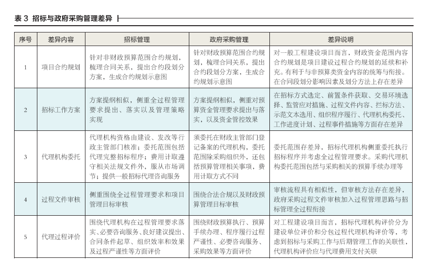 工程建設(shè)項(xiàng)目招標(biāo)管理是指站在建設(shè)全過程視角對招標(biāo)活動實(shí)施的一系列管理工作。同理,政府采購管理指采購人針對擬組織實(shí)施的采購活動開展的一系列管理工作。政府采購管理過程除遵循財(cái)政預(yù)算控制要求外,依然需將全過程思想貫穿始終。上述兩類活動管理目標(biāo)均包括降低過程風(fēng)險(xiǎn)、提升交易效率、確保交易質(zhì)量、滿足全過程管理要求等。招投標(biāo)或政府采購管理工作內(nèi)容均包括:合約規(guī)劃、工作方案編制、代理機(jī)構(gòu)委托、過程文件審核、招標(biāo)與采購代理過程評價等方面。針對上述內(nèi)容,兩類活動有關(guān)差異內(nèi)容詳見表3。